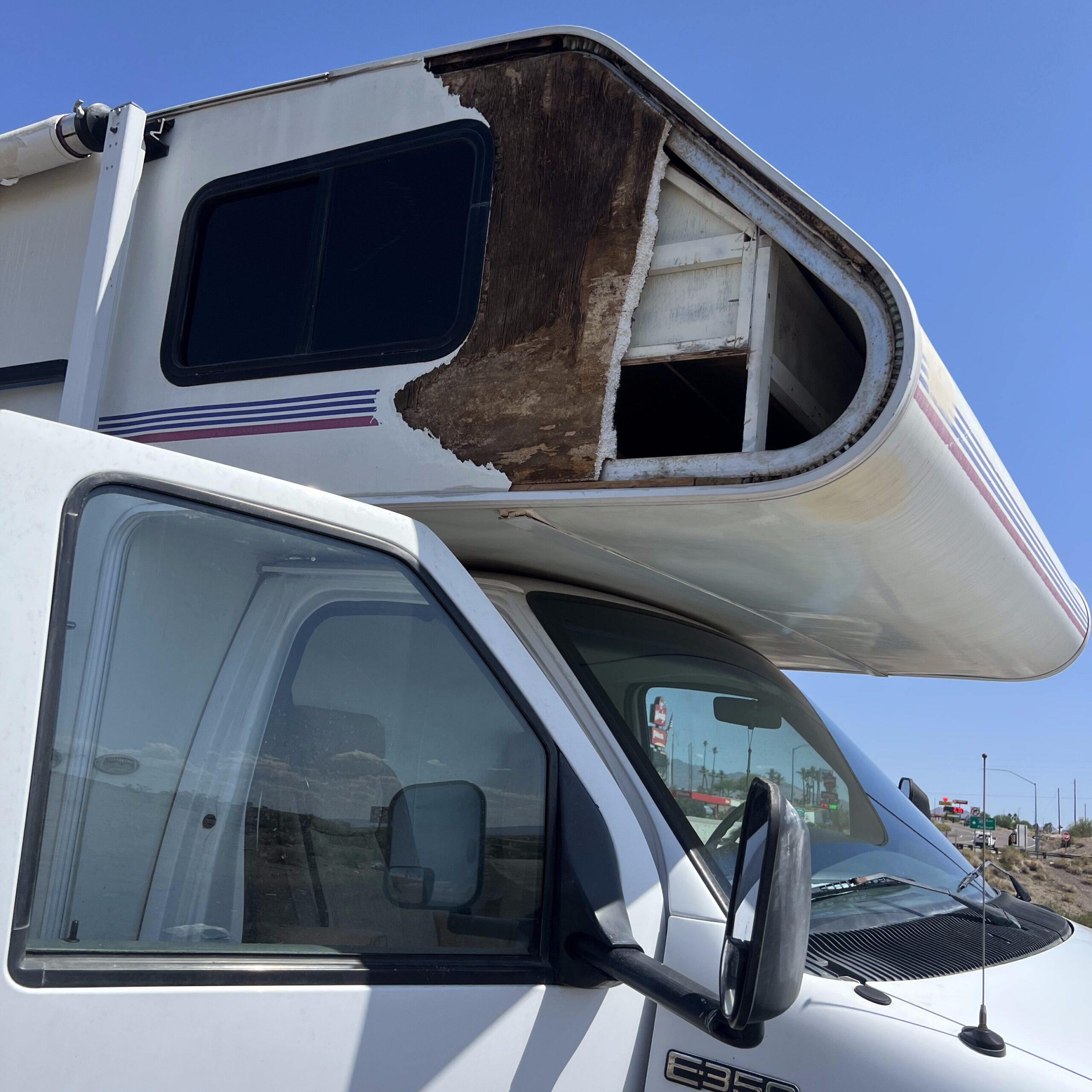 When I got to his side of the RV, I saw it — a big section of paneling above the cab was gone. Literally ripped off. It made no sense. I always inspect our RV before we travel. Nothing had been loose or concerning. It was as if something tore it away mid-drive.